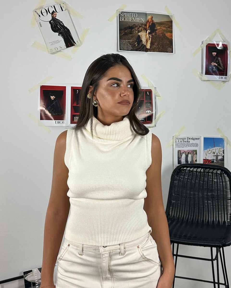 Maglione smanicato con colletto a polo, ideale da portare da solo o a strati.