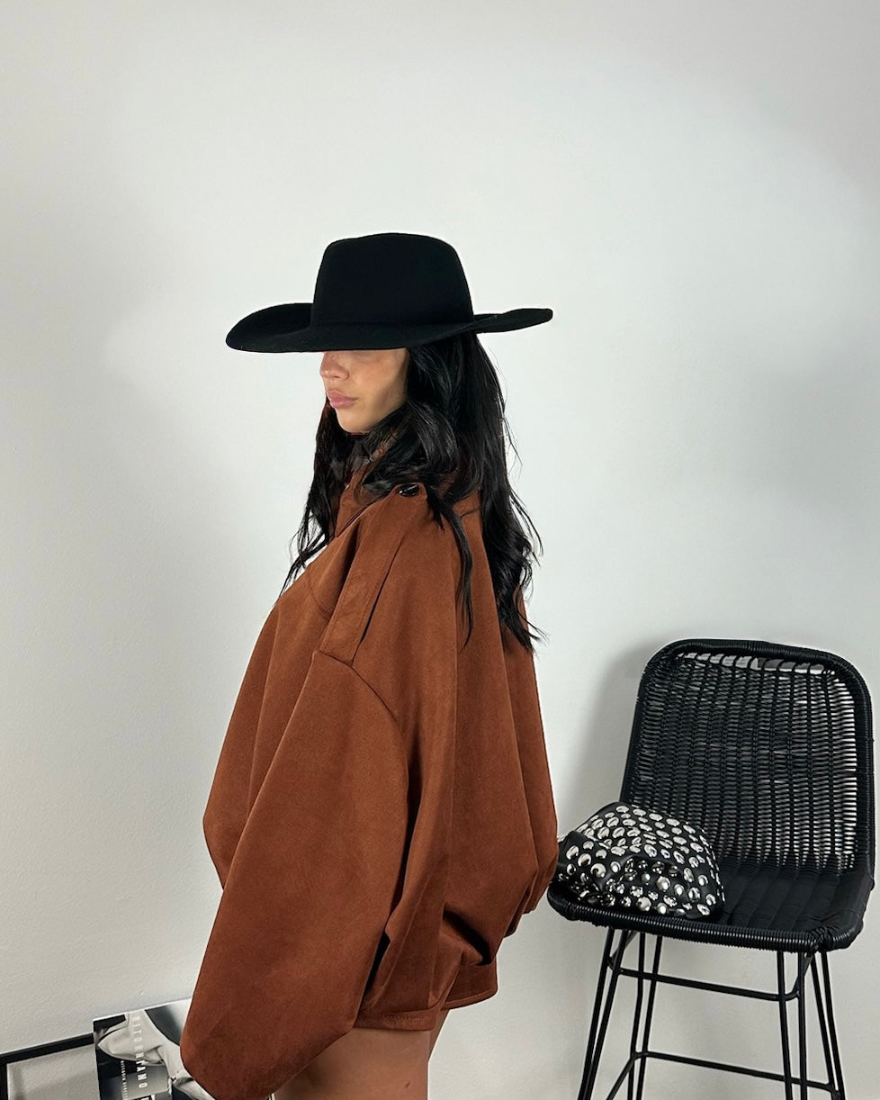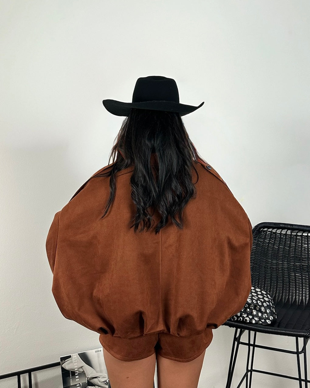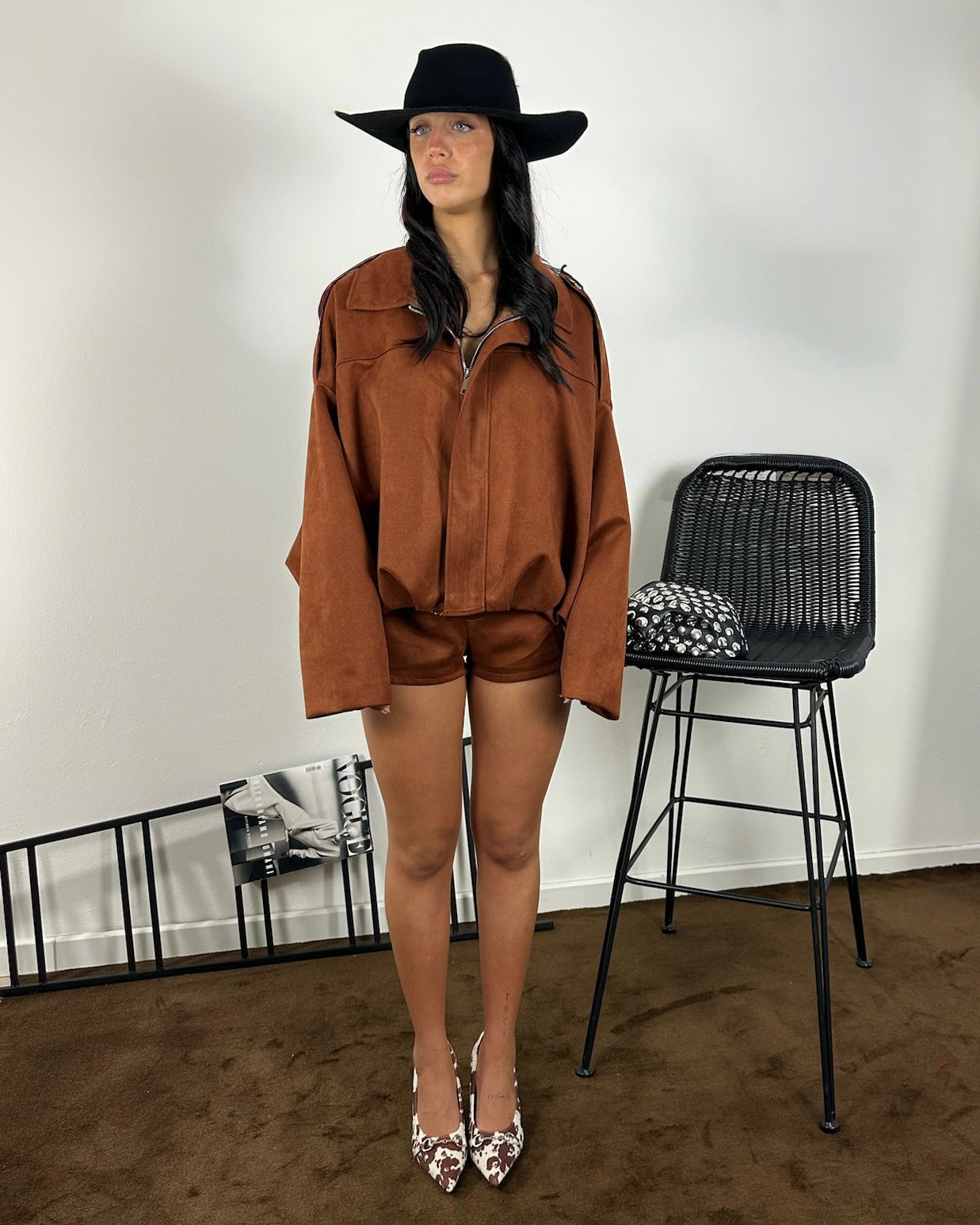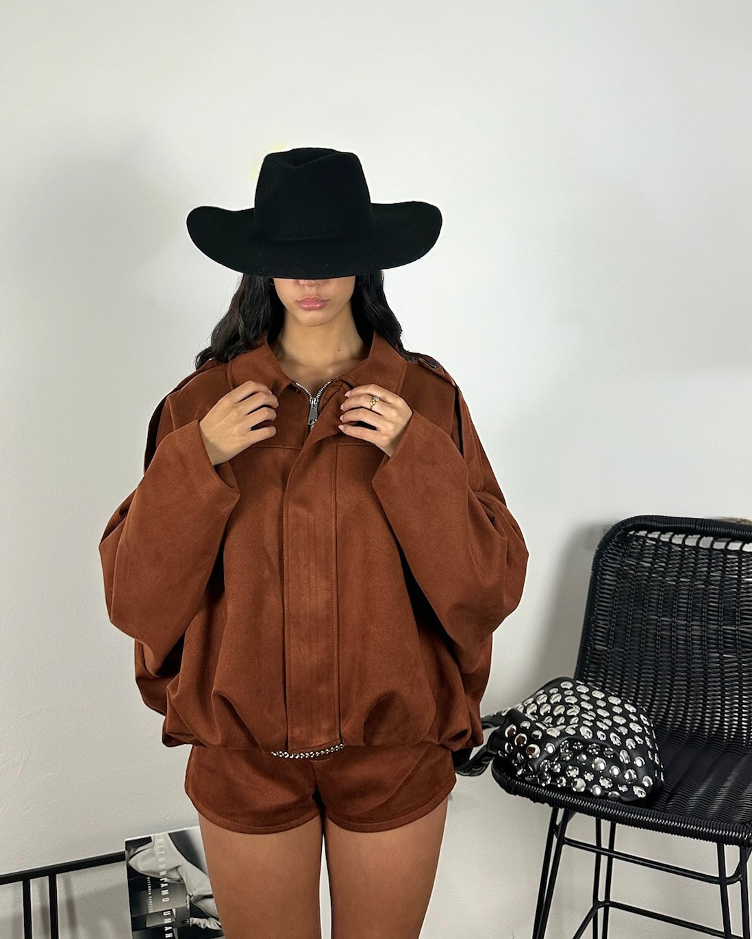 Set giacca e pantaloncino in tessuto color mattone, dal taglio pulito e linee essenziali.
