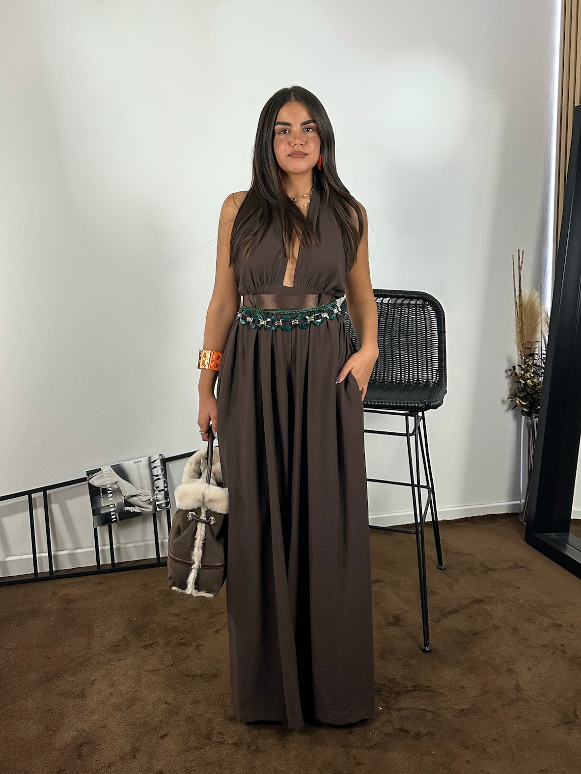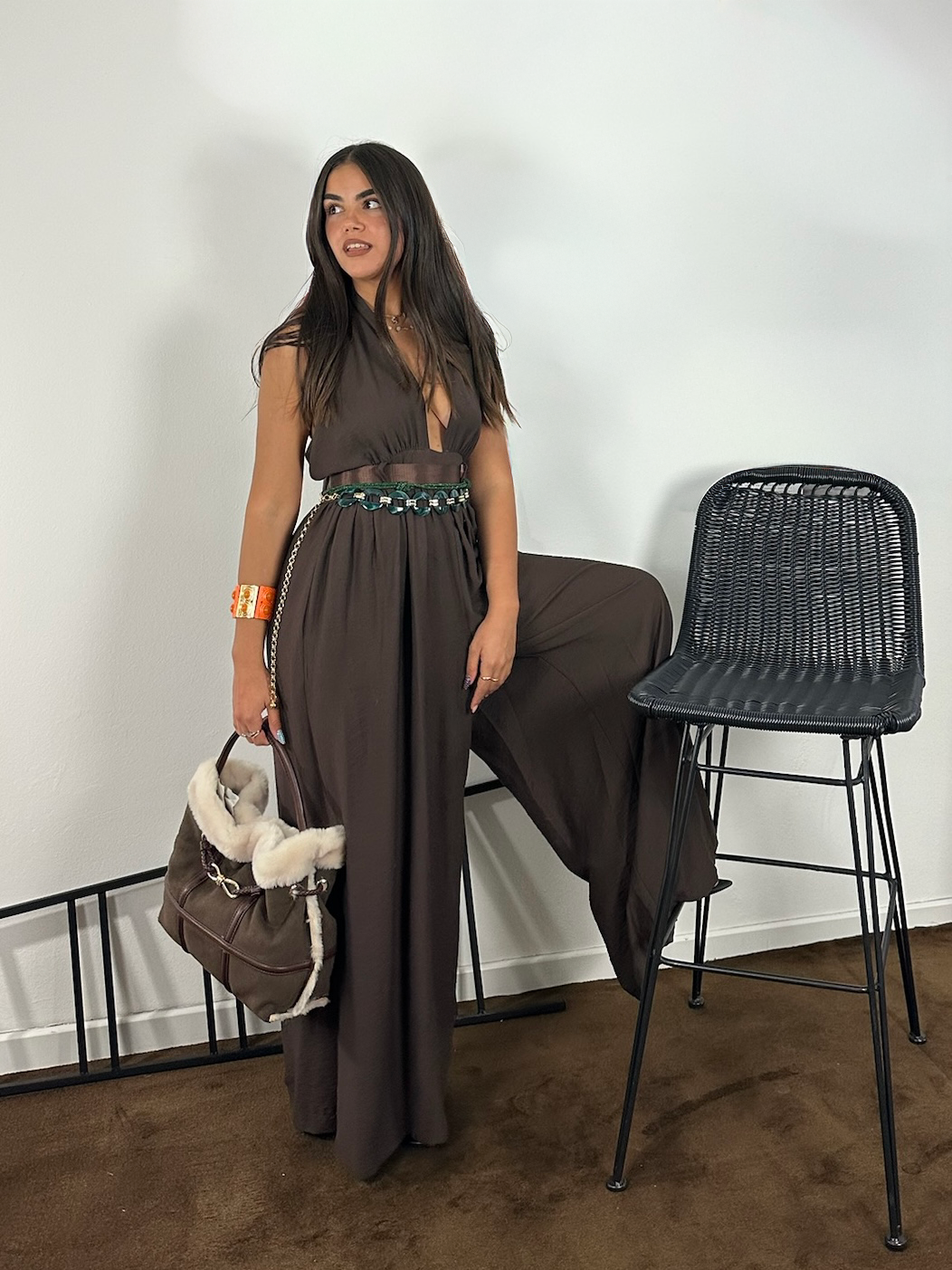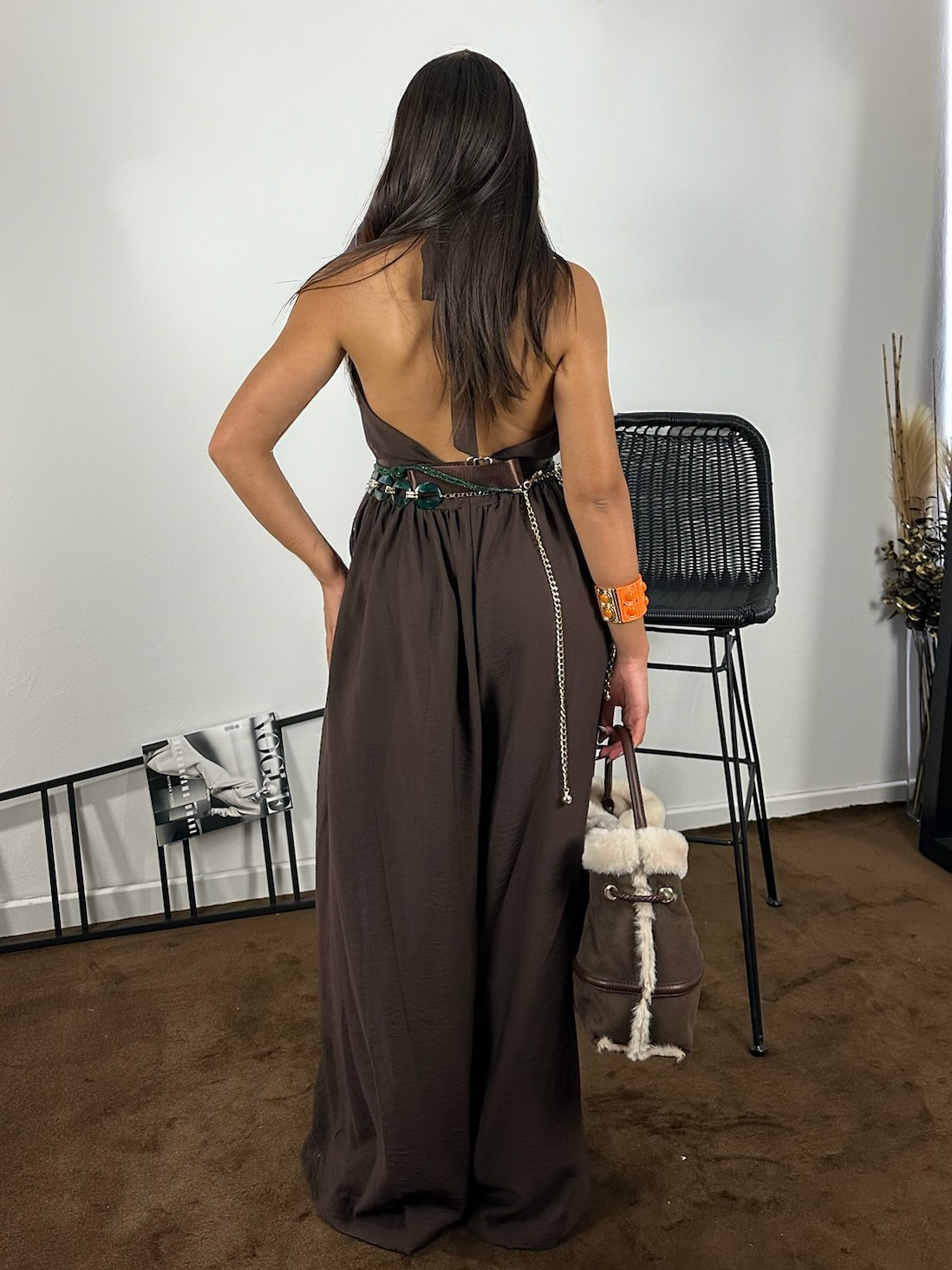 Tuta in tessuto marrone, morbida al tatto, con scollo profondo e schiena aperta che racconta una femminilità discreta.